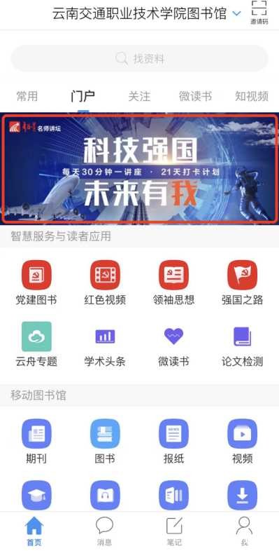1.扫描二维码下载“学习通”App并实名注册登陆,首页右上角输入邀请码“ynjtzyjsxy”进入图书馆首页。