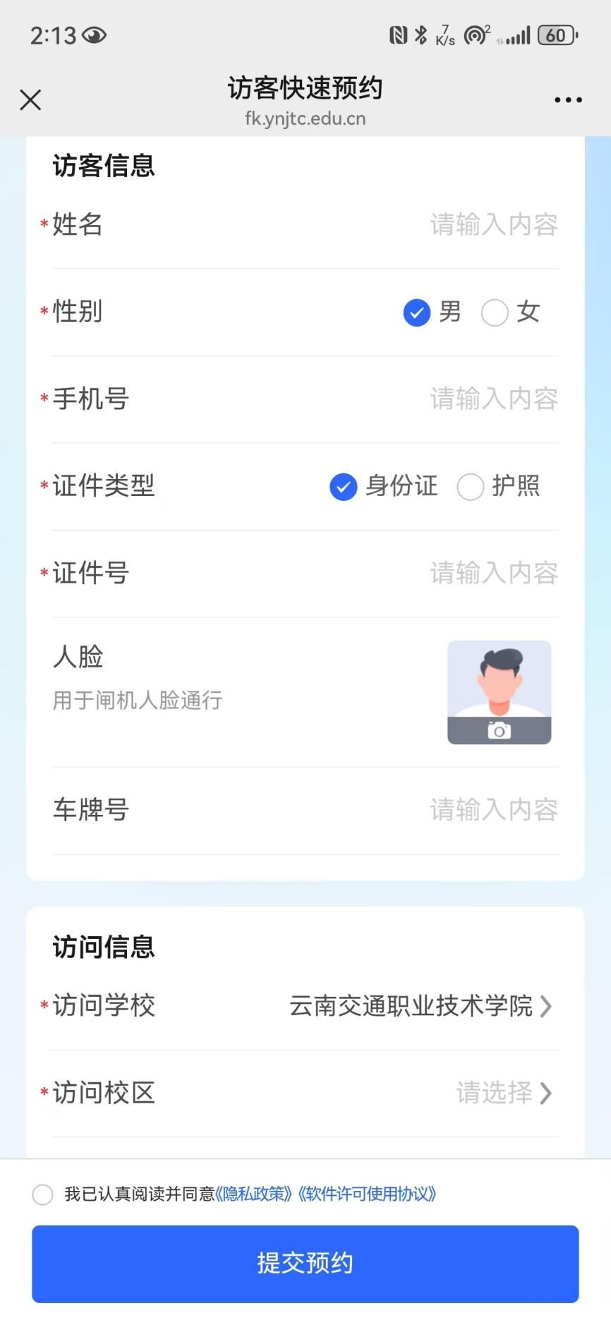 2关注后点击“快速预约”(经常访问学校的人员可以进行访客登录注册账号,填写相关信息)