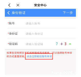 如果没有绑定手机或密保,可以通过移动端 APP 帐号申诉的方式找回密码,点击移动端首页的“忘记密码”进入安全中心,点击“立即前往账号申诉”:
